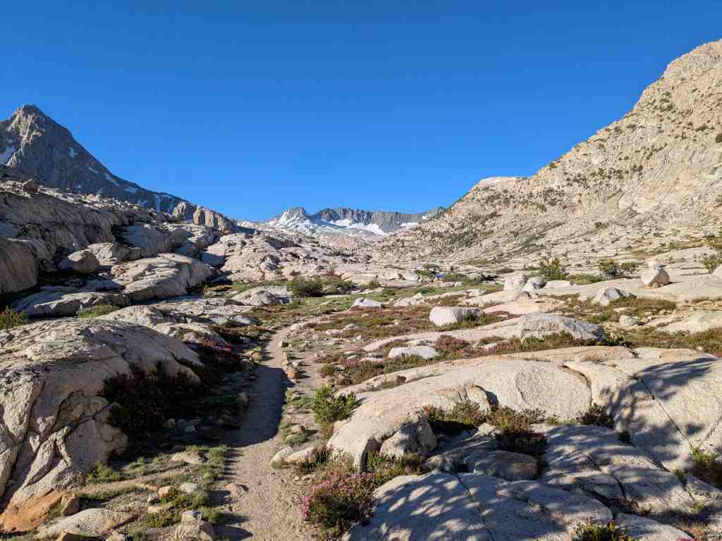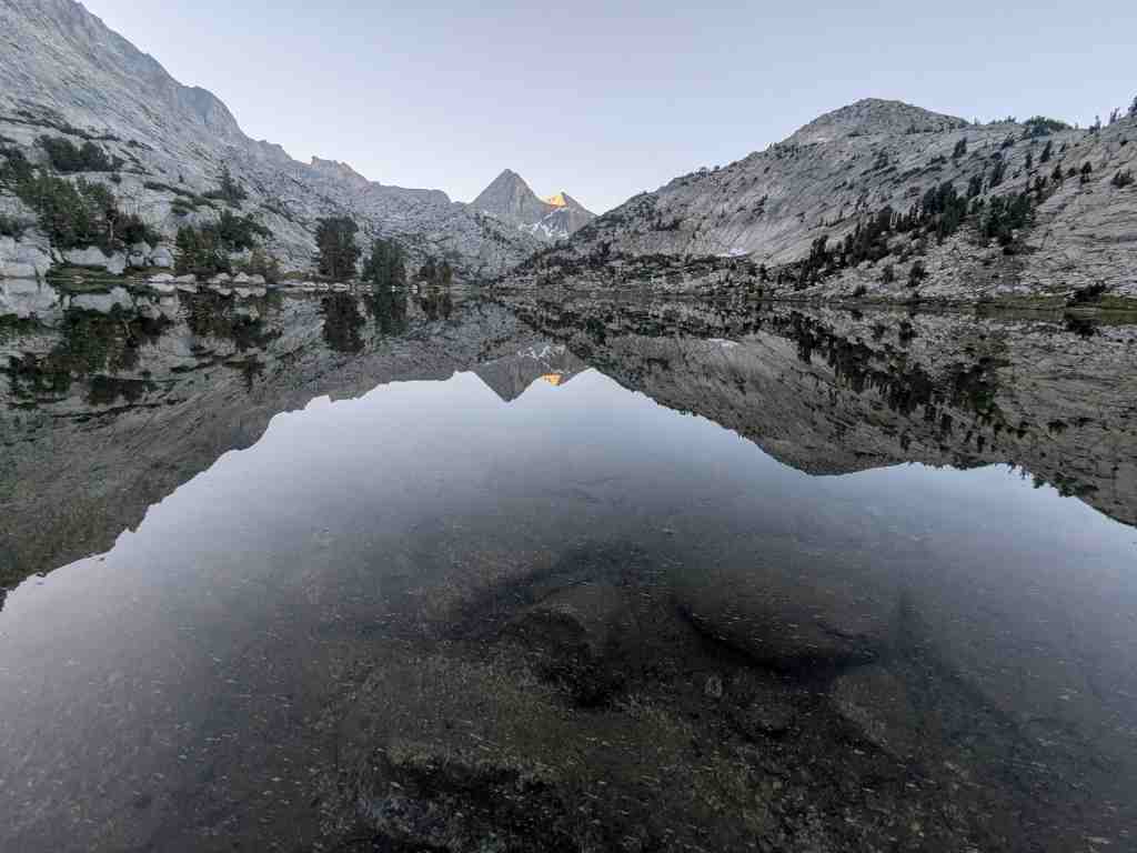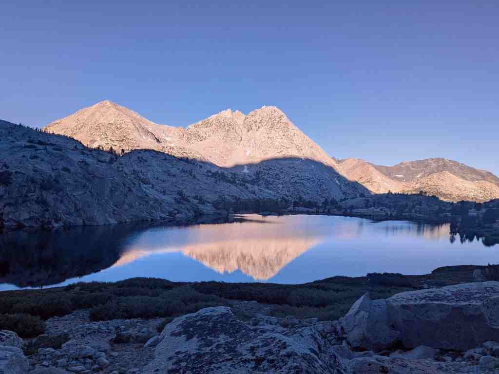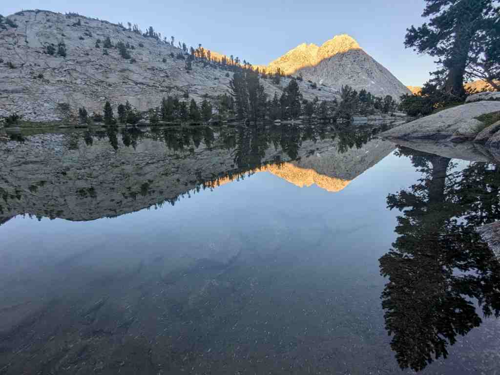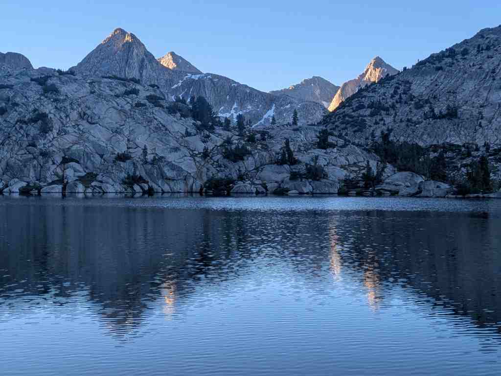 Ráno se hřeben za jezerem Evolution převlékl do jiných barev. Slunce se opřelo do svahů a všechno se rozzářilo – i moje chuť jít dál. Je fascinující, jak rychle se hory proměňují – stačí pár paprsků a krajina působí úplně jinak. Lákavě a vstřícně.