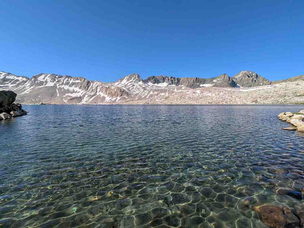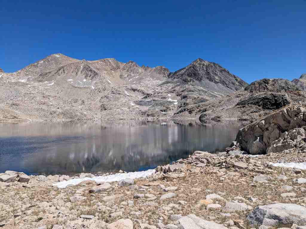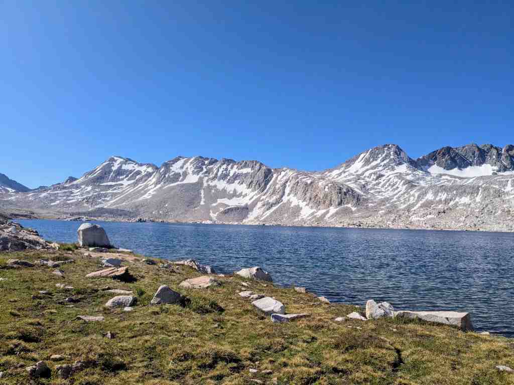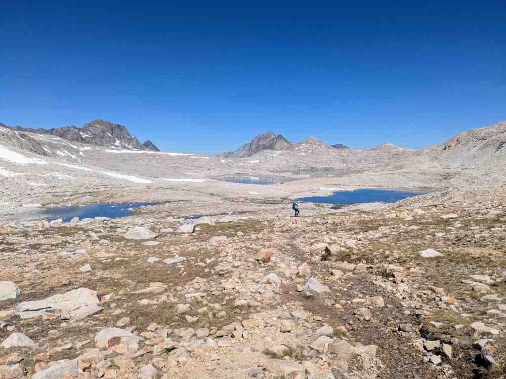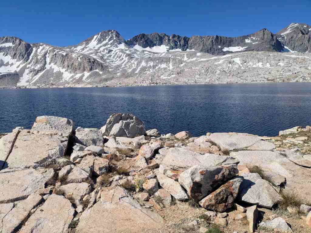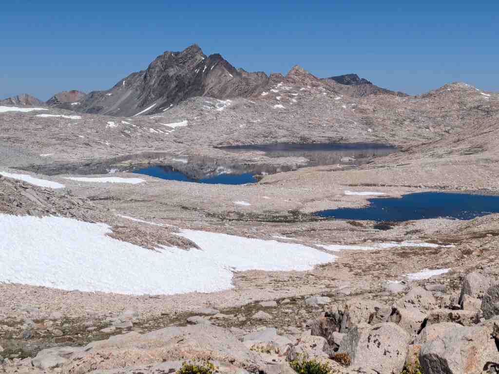 Stoupáme pozvolna kolem břehu a otevírají se nové výhledy. Každým krokem se mění záběr a já bych nejraději každou chvíli zastavovala a tu krásu fotila. Sapphire Lake, Huxley Lake, Wanda… Muir Pass je na dohled, ovšem na obloze není jediný mráček a ani kousek stínu. Klobouk, který jsem si ráno namočila, už dávno uschnul a já se zase peču ve vlastní šťávě.