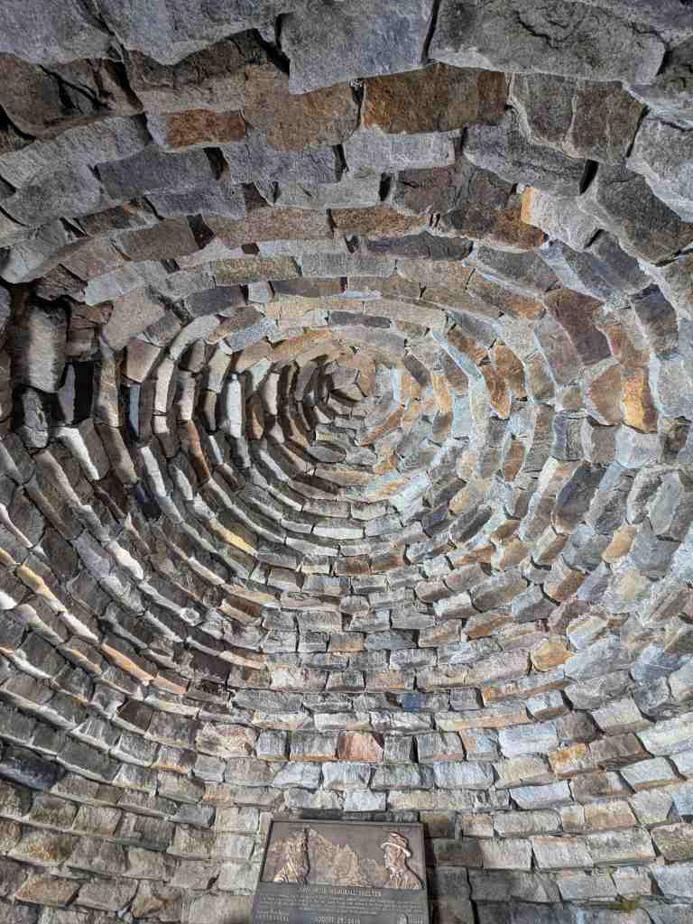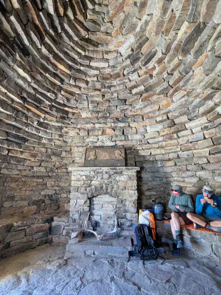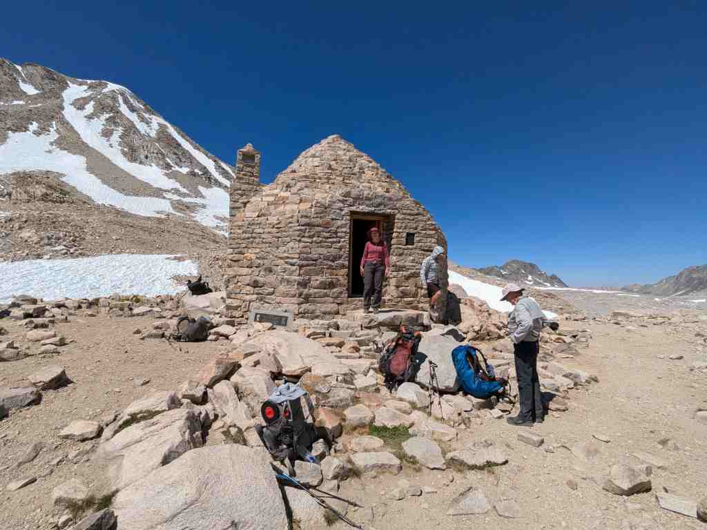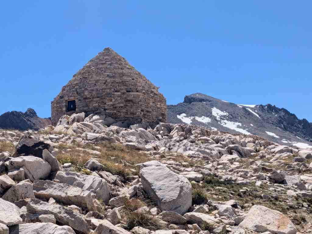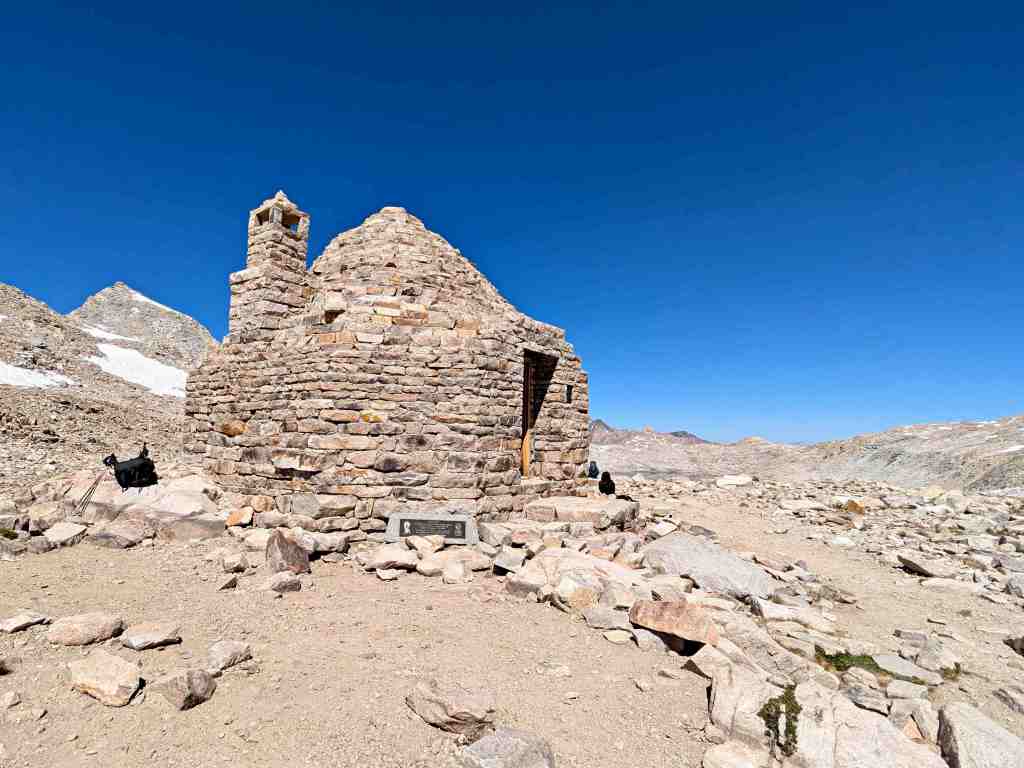 Na vrcholu odpočívají všichni – svačí, zevlují, nebo jen zírají do dálky. Mou pozornost přitahuje první stavba na trailu po dlouhé době. Zvláštní kamenné budově se říká John Muir Memorial Shelter nebo také Muir Hut. Byla vybudována organizací Sierra Club v roce 1933. Při nepřízni počasí se v ní dá schovat nebo dokonce přespat, a zároveň připomíná osobnost Johna Muira. V roce 2016 byla zapsána na Národní seznam historických míst jako památka. Uvnitř mě překvapuje vysoký strop a také „krb“; na kamenných lavicích kolem stěn se sice nedá pohodlně sedět, ale při nepřízni počasí bude každý rád za záchranu. Kovová plaketa nad krbem připomíná Johna Muira a také mecenáše George Schwarze, který útulnu financoval. Opravdu zajímavé a monumentální dílo v jinak pustých horách.