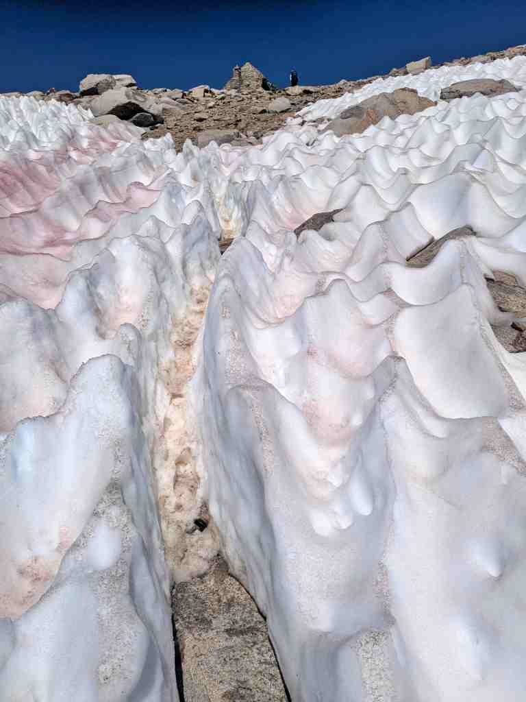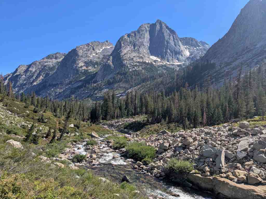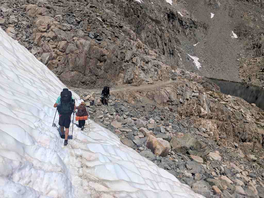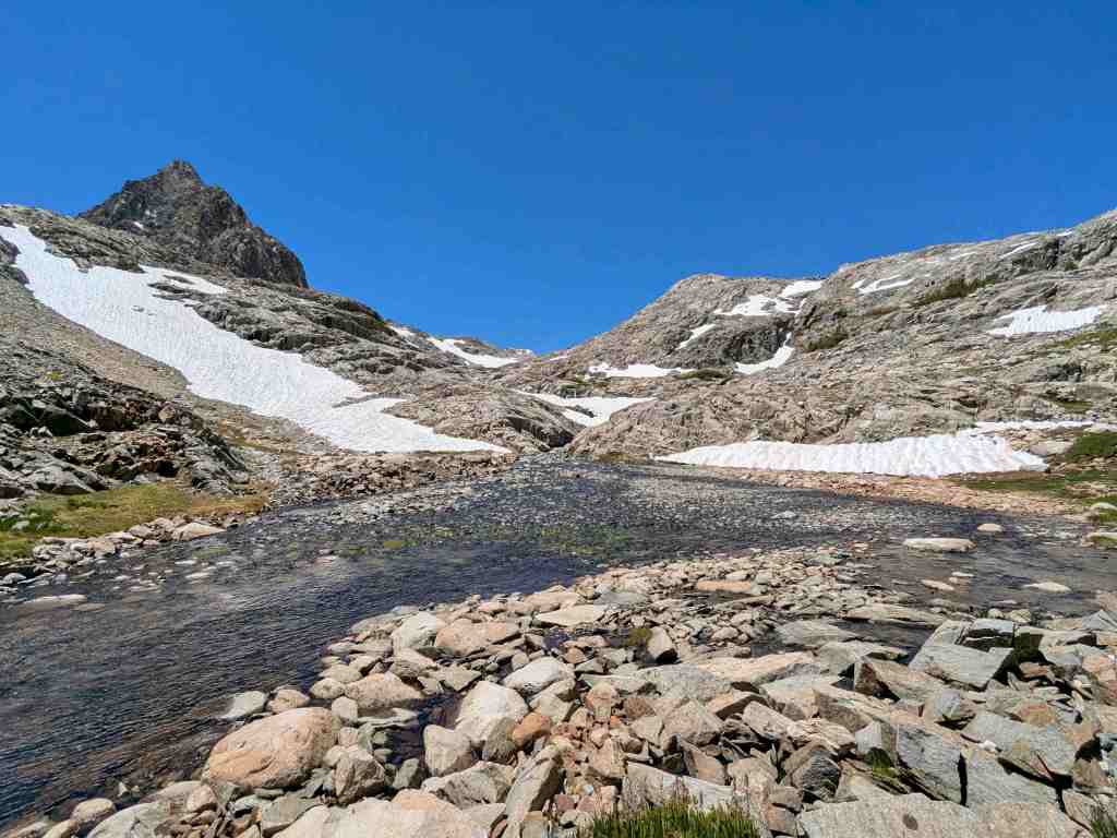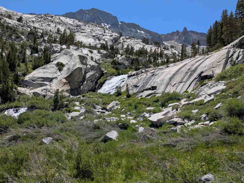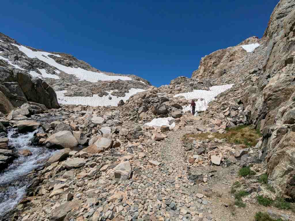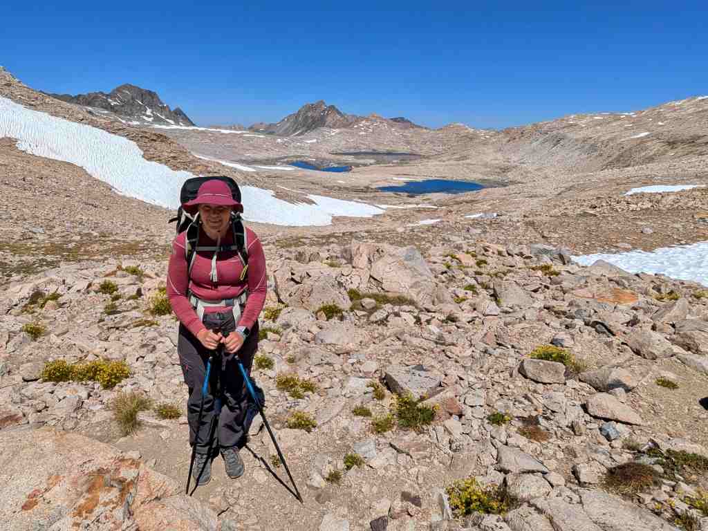 Míjíme jezero Helen, pojmenované po dceři Johna Muira – její sestra Wanda měla své jezero na druhé straně passu. A můj „oblíbený“ suťák… a další klouzavé sněhové pole… a další suťák… a další přeskakování prudkého potoka. Snažím se být plně soustředěná – stačí jedno škobrtnutí a hrozí velký problém. Takhle členitým terénem jsme tu ještě nešli. A já zjišťuji, že mě to vlastně hodně baví. Mnohem víc než monotónní stoupání vyšlapanou cestou. Takovéhle traily znám – ty už jsme dávali všude možně. Tohle umím. Normálně cítím radost.