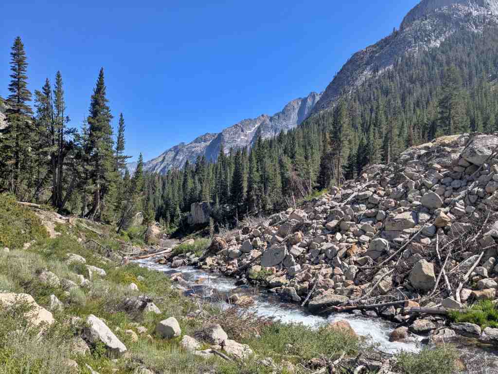 S vodou tu problém není, takže pořád máčím klobouk (a někde i boty), ale stín se nedaří najít… Když konečně dorazíme k prvním stromům, mám pocit, že jsem právě přežila pečení na kameni, tak konečně dojde na pozdní oběd. Podél Middle Fork Kings River a jejích peřejí směřujeme do údolí. Sklon je docela drsný a jsem ráda, že ho jdu dolů. V rozpáleném odpoledni potkáváme manželský pár kolem sedmdesátky, jak statečně nesou poměrně velké batohy vzhůru. Ještě dlouho na ně myslím – kam asi došli?