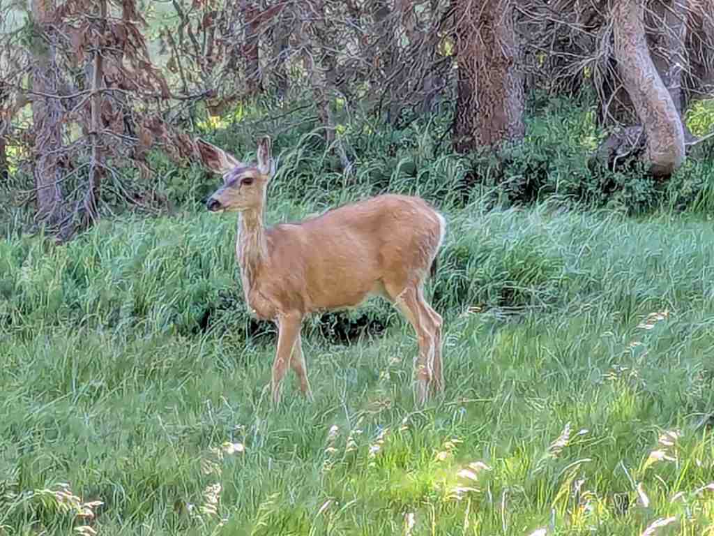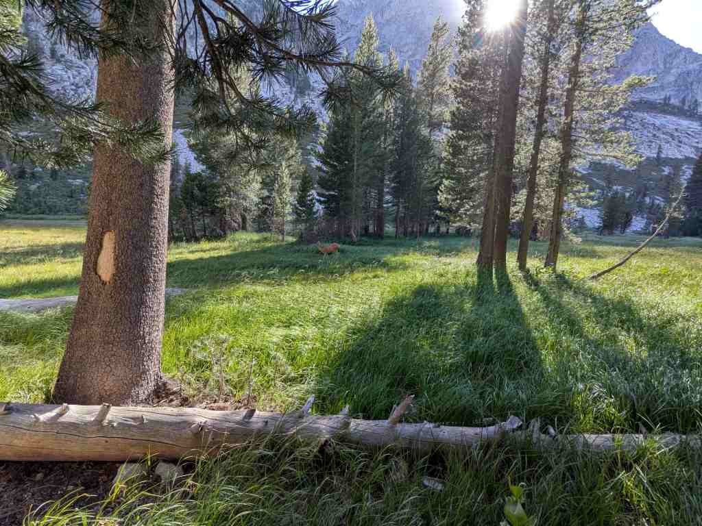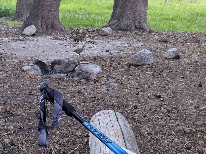 Na doporučení aplikace FarOut si vybíráme tábořiště u vlhkých luk – prý jedno z nejkrásnějších tábořišť na PCT. A nelžou – je tu krásně. Pár metrů od nás se poklidně pase ušatá srnka, kolem stanu běhá koroptvička s kuřátky. Jen k vodě je to dál a trochu bahnem. Na ledovou vodu si asi nikdy nezvyknu, ale stejně tam lezu – pomalu a opatrně. Myjeme se, pereme, nabíráme vodu na vaření, abychom se sem nemuseli znovu vracet. Vidíme, že po cestě prochází dvojice, kterou jsme si pojmenovali jako „holky“, se kterými se potkáváme už třetí den. Svým strojovým tempem pokračují i večer. Zdeněk pronese, že kdybych šla tak rychle jako ony, můžeme dělat větší pauzy. Grrrrr. On si snad myslí, že jdu pomalu schválně… V pohodě. Zakopu si ho sama.