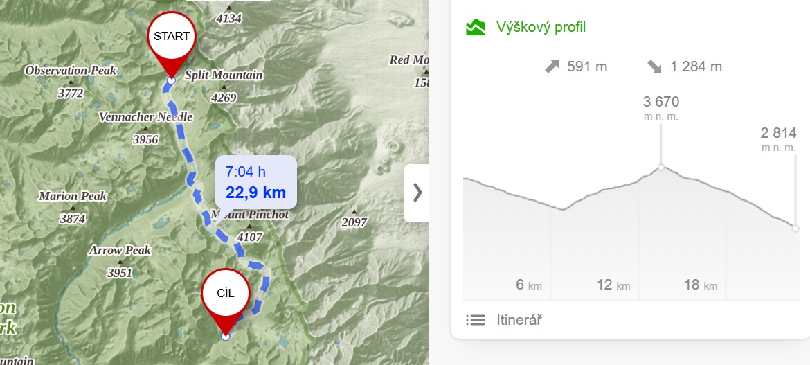 Nahoru to máme šest kilometrů a šest set výškových metrů, takže vlastně nic obtížného – cesta stoupá pozvolna a pohodlně. V pohodě ovšem nejsem já. Šlape se mi špatně, jako by mi došla síla. Vlastně se vleču. Zdeněk na mě naléhá, ať se víc snažím, ale já už opravdu nevím, co víc dělat. Dokonce si říkám, jestli třeba nemám málo červených krvinek nebo jiný „fyziologický“ důvod. Fyzičku mám přiměřenou věku; i když jsem se ji snažila zlepšit od chvíle, kdy jsem věděla, že trek půjdeme, příliš se nezvedla. V horách kráčím hlavně „na morál“. Vyjdu vše, nezhroutím se, neodpadnu, ale jsem prostě zoufale pomalá. Do průsmyku Pinchot Pass (3697 m) přicházím někdy po půl třetí. Vydýchneme se, pokocháme a pokračujeme dolů. Zdeněk se při čekání baví focením svišťů, kterých je tu opravdu hodně – jsou zvědaví a zároveň lekaví. Je s nimi legrace.