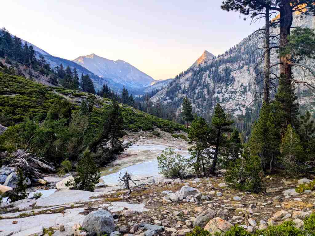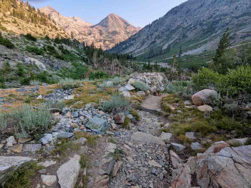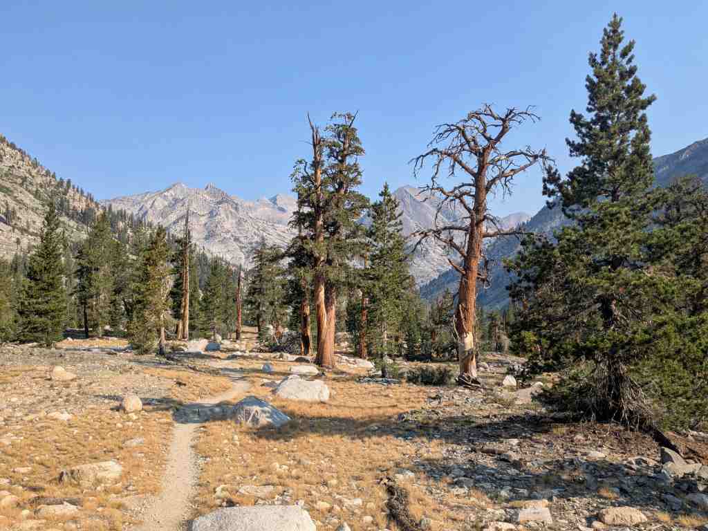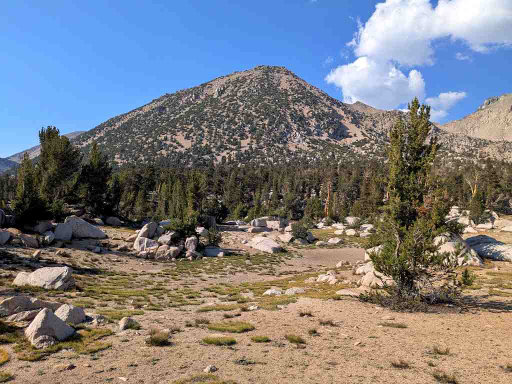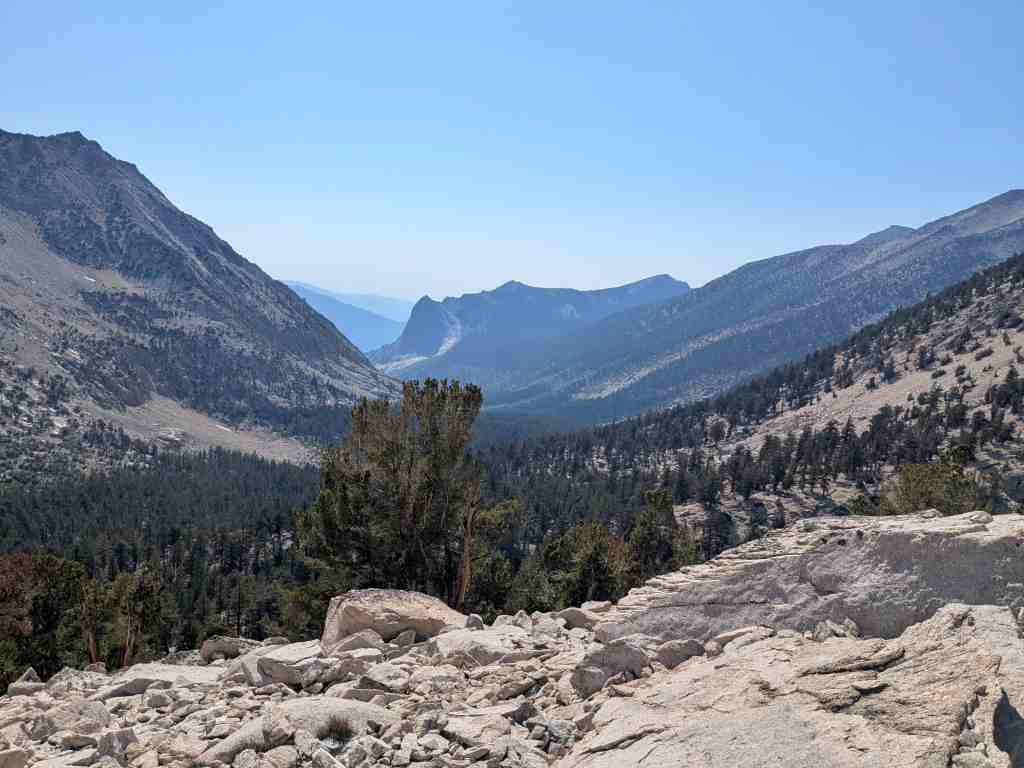 Klesání je tentokrát příjemné. Voda už tu není, jen občas lehký stín. Míjíme odbočku na Kearsarge Pass – nebudeme se zdržovat a zkusíme dojít k jídlu, které máme v bear canistru. Změna přišla ve správný okamžik. Teď už vím, že to zvládnu. Každé údolí je tu jiné: tohle je ploché, jako by ho vytvořily nánosy z řeky, ale ta se teď vytratila. Na jaře to tu musí vypadat docela jinak.