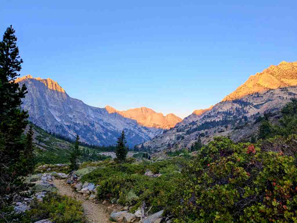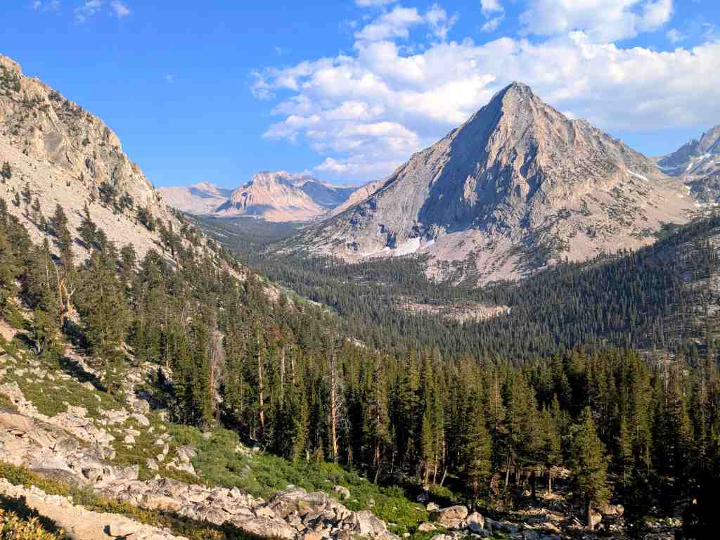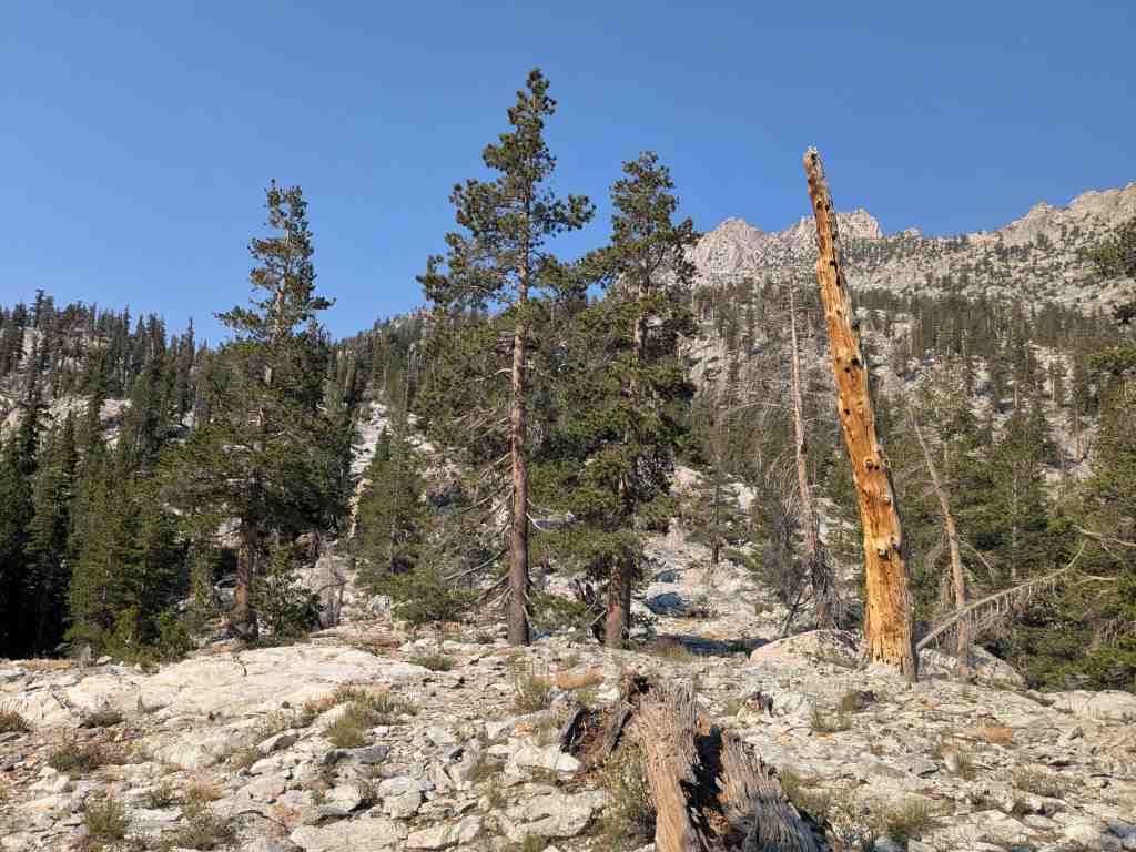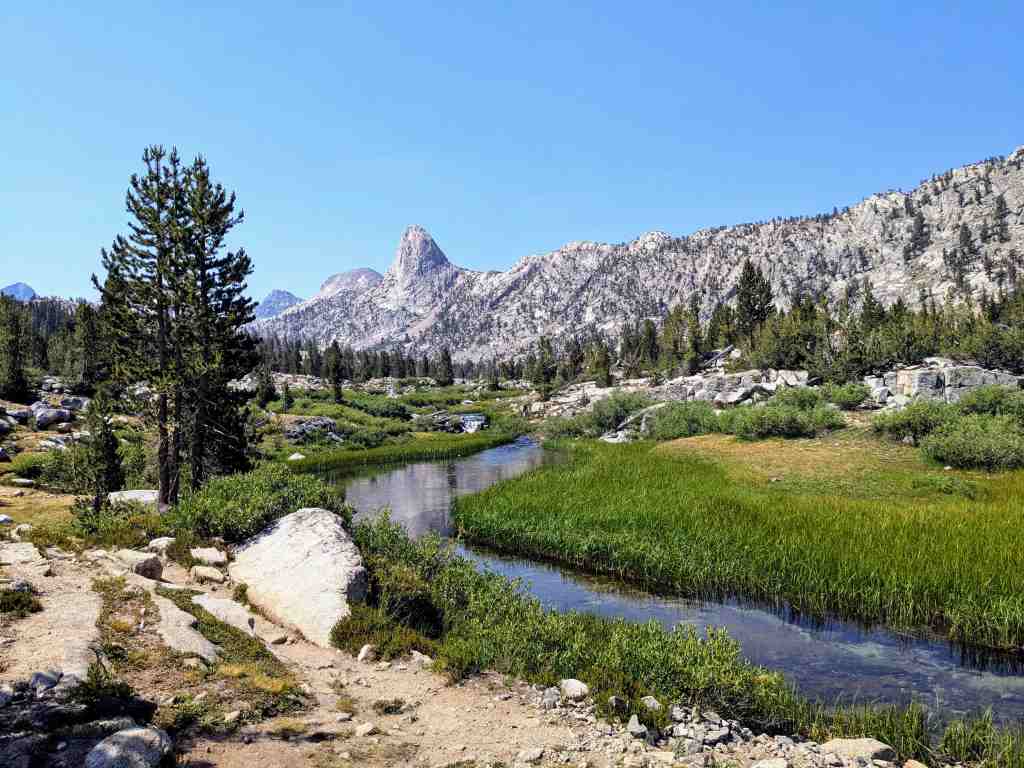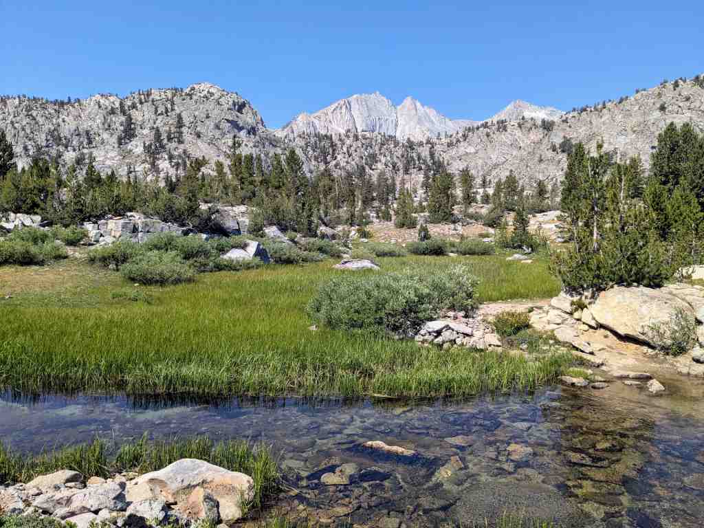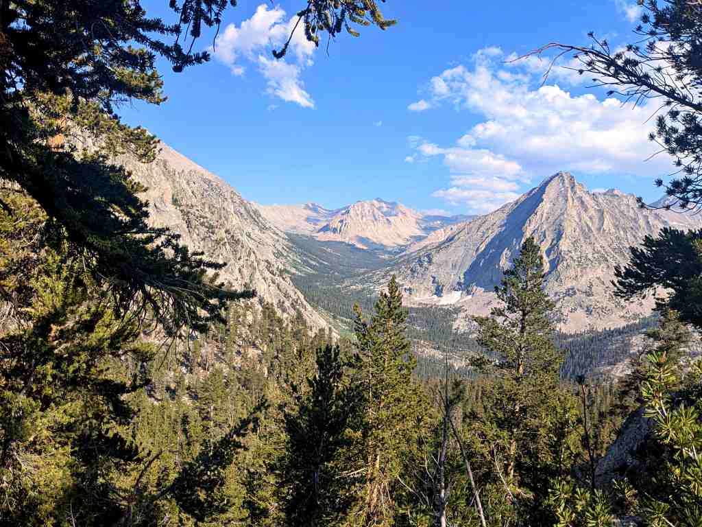 Klesání je tentokrát příjemné. Voda už tu není, jen občas lehký stín. Míjíme odbočku na Kearsarge Pass – nebudeme se zdržovat a zkusíme dojít k jídlu, které máme v bear canistru. Změna přišla ve správný okamžik. Teď už vím, že to zvládnu. Každé údolí je tu jiné: tohle je ploché, jako by ho vytvořily nánosy z řeky, ale ta se teď vytratila. Na jaře to tu musí vypadat docela jinak.