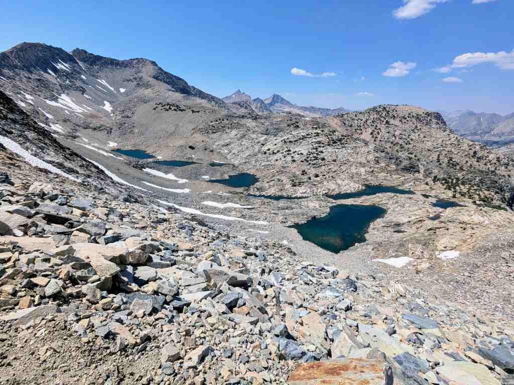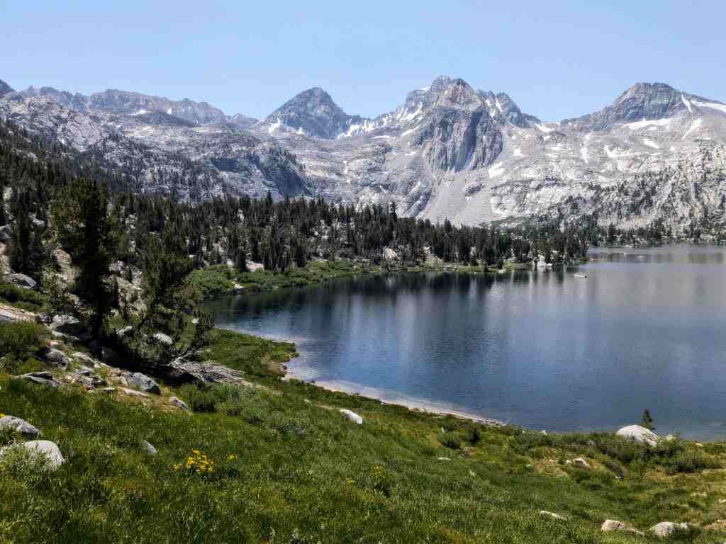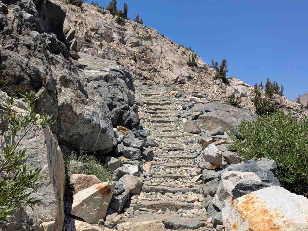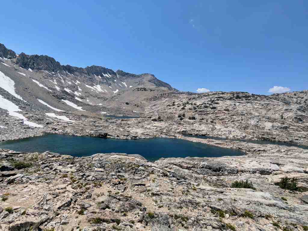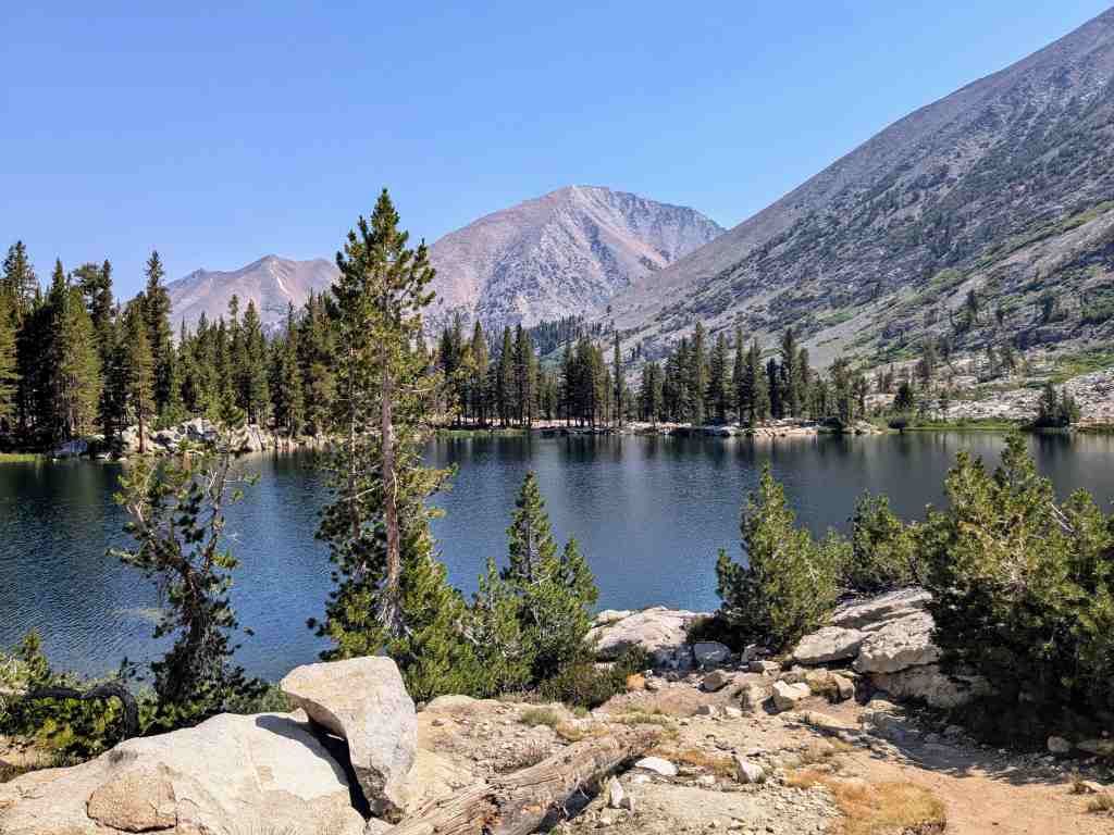 Klesání je tentokrát příjemné. Voda už tu není, jen občas lehký stín. Míjíme odbočku na Kearsarge Pass – nebudeme se zdržovat a zkusíme dojít k jídlu, které máme v bear canistru. Změna přišla ve správný okamžik. Teď už vím, že to zvládnu. Každé údolí je tu jiné: tohle je ploché, jako by ho vytvořily nánosy z řeky, ale ta se teď vytratila. Na jaře to tu musí vypadat docela jinak.
