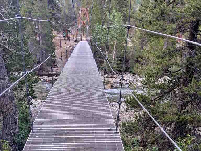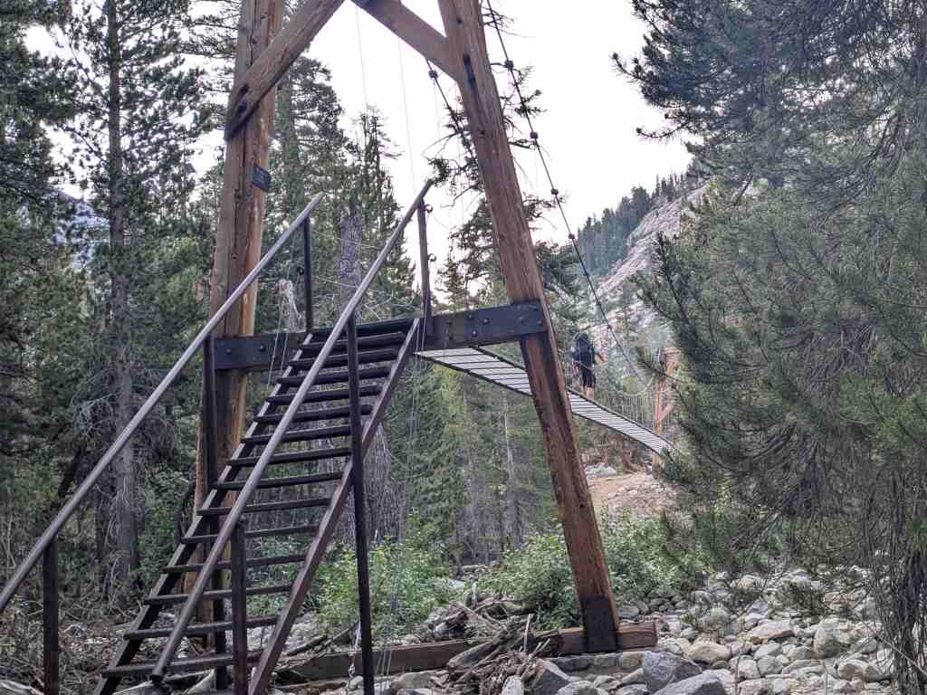 O půl hodiny později se skutečně z protisměru vynořuje silueta postavy. Na okamžik doufám, že bude mít příběh šťastný konec. Jenže muž se zastaví, zouvá boty a místo k nám kráčí do říčního proudu, který se tu rozlévá mezi kameny. Tak nic, třeba bude ještě šance… Přecházíme Woods Creek po lanovém mostě, pod nohama se houpe tichá hloubka a voda šumí. Za mostem se chystají vyrazit dva další hikeři. Ptám se, jestli míří k Pinchot Passu – ne, jdou stejným směrem jako my. Tak šance poslat bundu za majitelem mizí. Škoda.