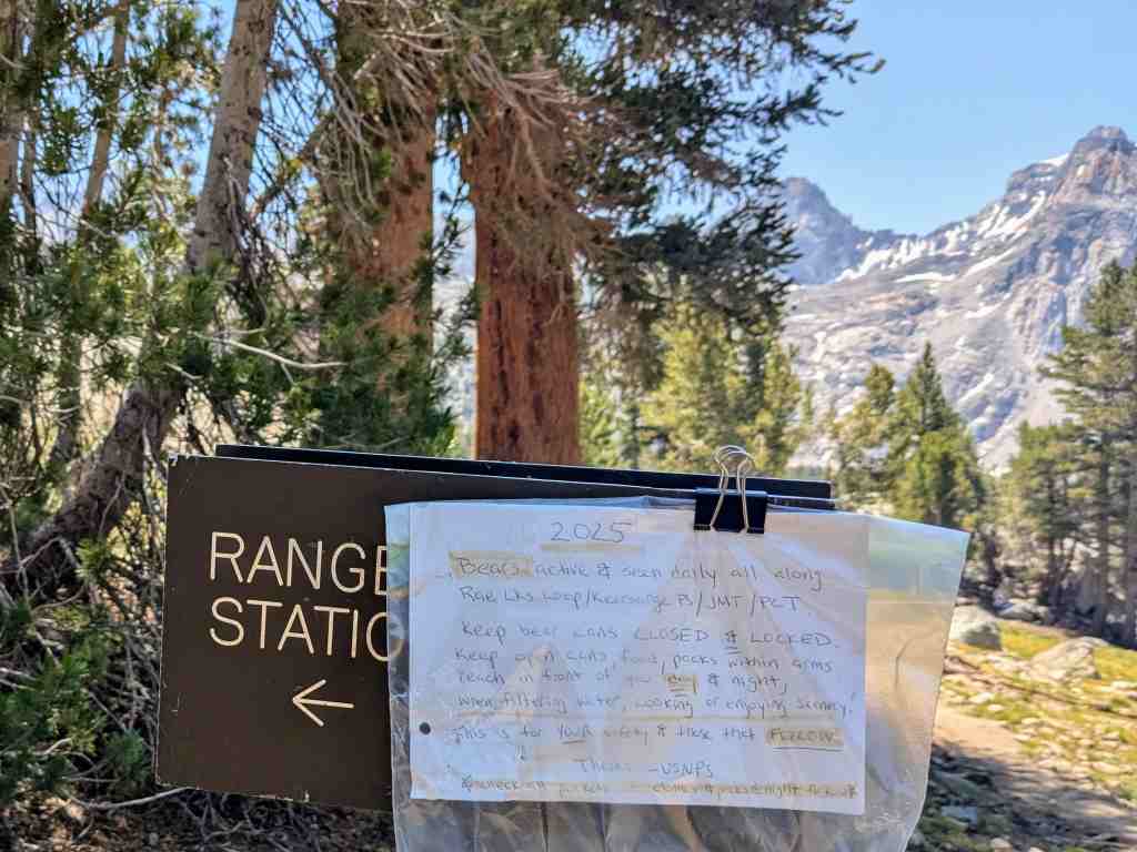 Údolím se klikatí potůčky a pramínky, přes které přeskakujeme po kamenech. Vody je tu dost, a zatím i stínu. Jde se mi překvapivě dobře. Lehce jsem změnila způsob, jak držím hůlky, a mám pocit, že postupuju rychleji. Před polednem míjíme rangerskou stanici, vedle cesty leží ručně psaný vzkaz: „Jsou tu často medvědi 🐻. Držte si jídlo.“ Dobře, rozumím. Chápu to tak, že nás kvůli jídlu nenapadnou, ale stejně…. Nemám z toho dobrý pocit. Živého medvěda jsem zatím neviděla – jen stopy a trus v Kanadě – ale i to bohatě stačilo.