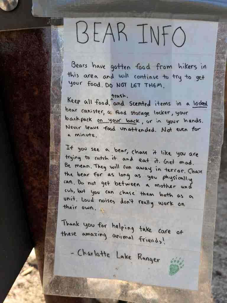 U odbočky na Charlotte Lake visí další vzkaz od rangera, který mě vyděsí ještě víc než ten první. Turisté prý krmili medvědy 🐻 – a ti si zvykli, že potrava se dá získat snadno. Jsou čím dál méně plaší. Pokud je potkáte, píše ranger, musíte je pronásledovat, jako byste je chtěli ulovit. Nestačí řvát, musíte běžet, dokud nepadnete. Jestli narazíte na medvědici s mláďaty, nelezte mezi ně, ale pronásledujte je jako pár. Skvělé. Už se vidím, jak s batohem na zádech běžím směrem k medvědovi do totálního fyzického vyčerpání. Snad na žádného nenarazíme – určitě bych běžela směrem opačným.