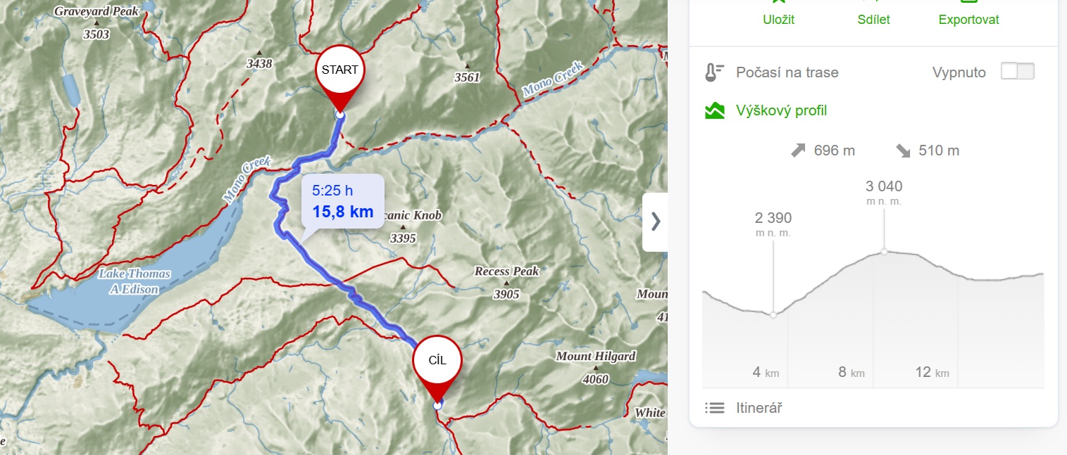 Nedaleko jezera Edison stojíme před rozhodnutím. Buď si počkat na loďku, zaplatit dvacet dolarů za osobu a nechat se odvézt na druhý konec jezera, do resortu podobného Reds Meadow – k civilizaci, kde je obchod, sprcha, elektřina a možná i signál. Nebo obejít jezero pěšky – deset kilometrů tam a deset zpátky. Tedy obětovat celý den jen kvůli repelentu. Zní to trochu jako jet do Paříže jen kvůli rohlíkům. Jídla máme dost, hygienu doženeme na Muir Trail Ranch. Vzdáváme to, snad si bugové to nejhorší už vybrali.