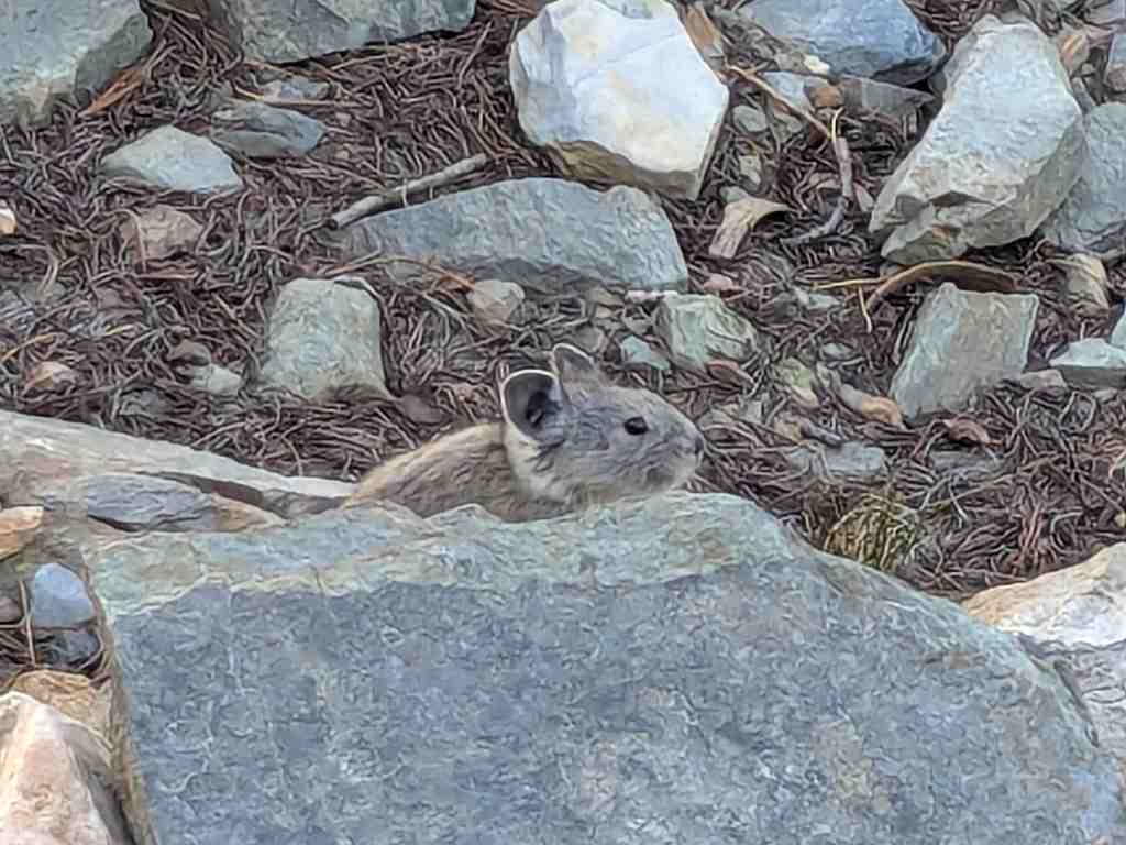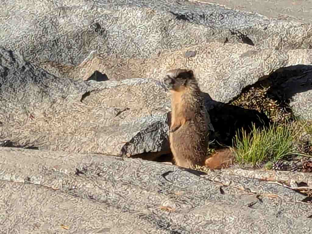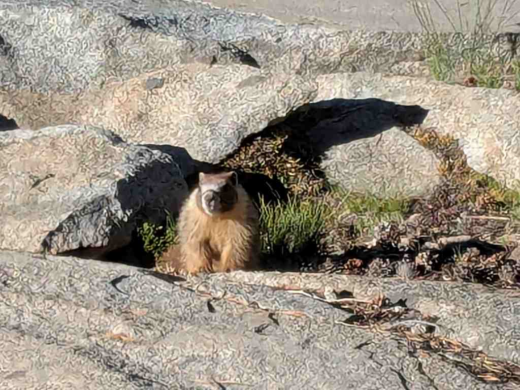Cestou potkáváme první slečnu v protisměru, evidentně hikerka jdoucí PCT. Usměje se a pronese něco o tom, že next are so cuuute… Další slova mi unikají. Že by myslela ty naše komáry, kteří koušou i přes mikinu? Pochybuji. O chvíli později mezi kameny zahlédnu malé zvířátko s kulatýma ušima – jako zmenšeninu králíka, kterého jsme kdysi viděli v Himálaji. A pak už Zdeněk usilovně fotí: všude kolem pobíhají svišti. Jsou menší než ti alpští a mají světlou náprsenkou, ovšem s typickým svištím výrazem – zvědaví, ale opatrní.