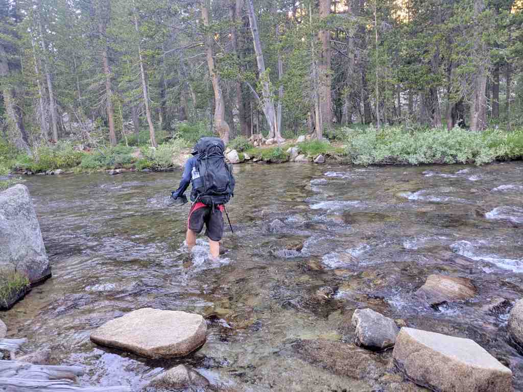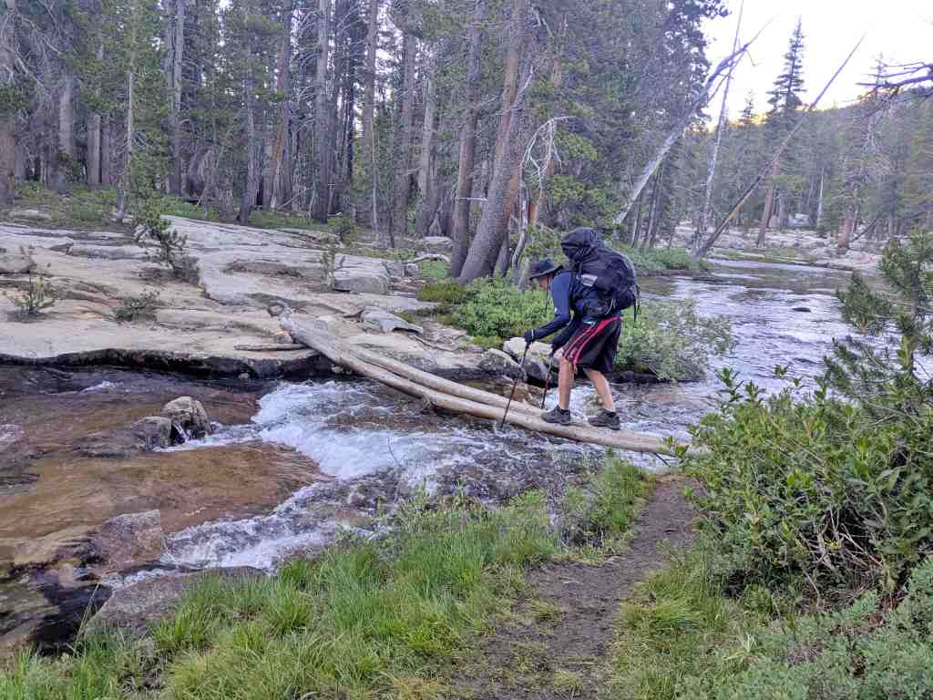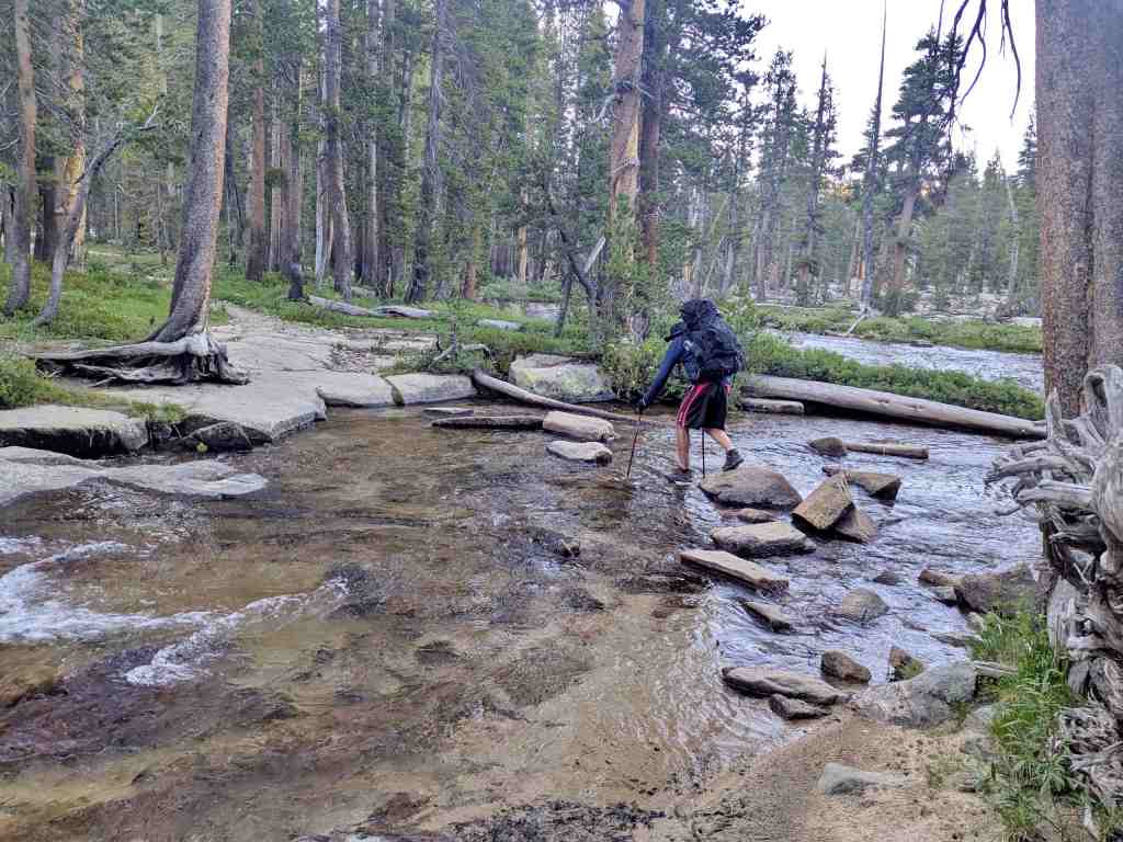 Ráno se budím krásně odpočinutá. Překvapivě všichni bugové nezmizeli. Zdá se, že ty malé potvůrky mají výdrž – možná větší než my. Balíme v rekordním čase, v 6:15 už jsme připraveni k pochodu. Stezka se vine podél Bear Creeku a přecházíme všechny přítoky – vody je tu opravdu dost. Občas stačí přeskočit z kamene na kámen, jindy se musíme odvážit po kládě, která má být „mostem“. Dojde i na klasické brodění. Voda je ledová a proud tak silný, že mi nohy brní ještě dlouho poté, co se dostaneme na druhý břeh.
