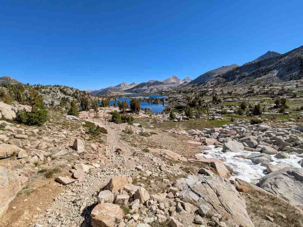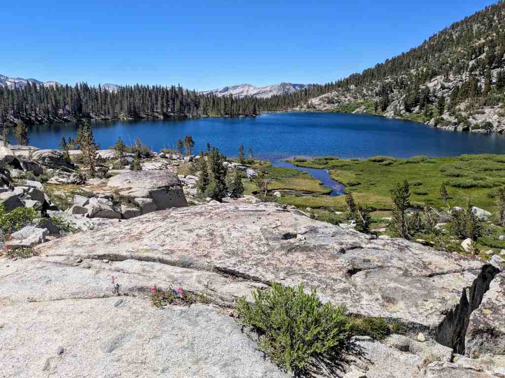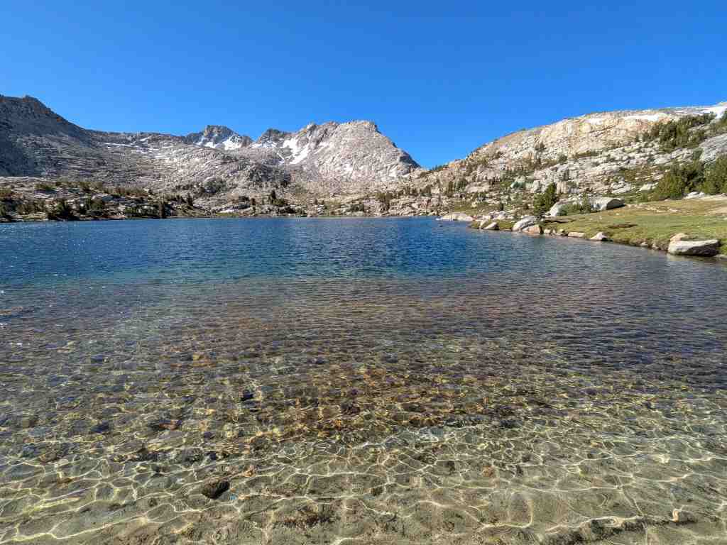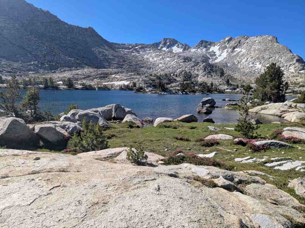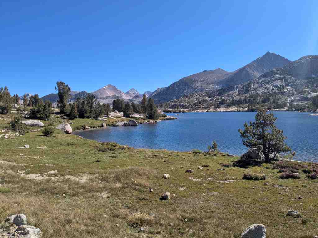 Před Rosemary Meadow ještě stojí pár stanů, hikeři líně balí. Asi bychom sem včera došli, ale v aplikaci FarOut tábořiště nikdo neoznačil. Nevadí – aspoň máme vypráno a načerpali jsme více sil. U Maria Lake si někteří rozložili stany přímo na břehu, i když se to oficiálně nesmí. Ale jak odolat – jezero je jako z pohlednice. Voda se leskne, obklopená balvany, a zrcadlí oblohu, která je dnes bez jediného mráčku. Takovému noclehu se nevyrovná žádný pětihvězdičkový hotel.