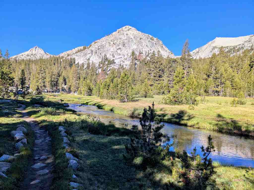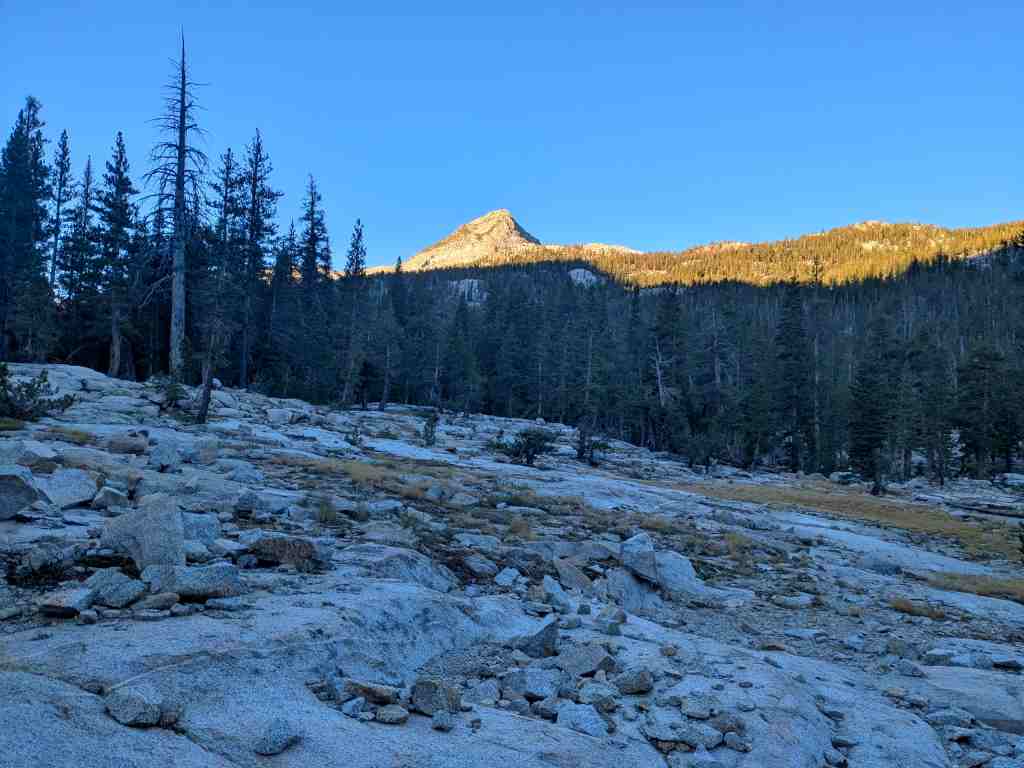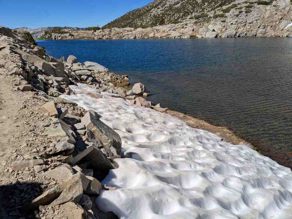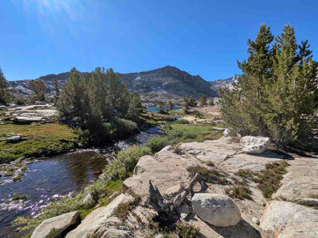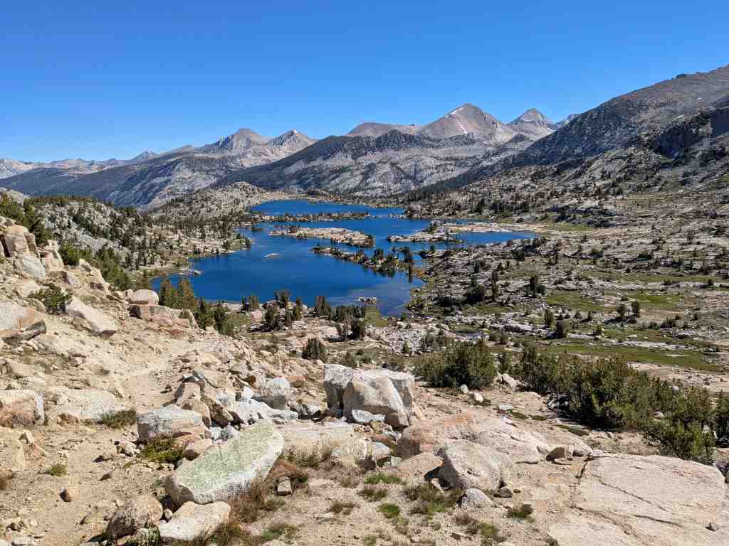 Před Rosemary Meadow ještě stojí pár stanů, hikeři líně balí. Asi bychom sem včera došli, ale v aplikaci FarOut tábořiště nikdo neoznačil. Nevadí – aspoň máme vypráno a načerpali jsme více sil. U Maria Lake si někteří rozložili stany přímo na břehu, i když se to oficiálně nesmí. Ale jak odolat – jezero je jako z pohlednice. Voda se leskne, obklopená balvany, a zrcadlí oblohu, která je dnes bez jediného mráčku. Takovému noclehu se nevyrovná žádný pětihvězdičkový hotel.