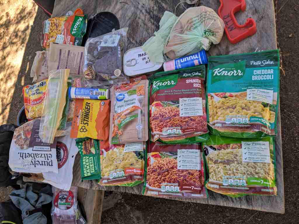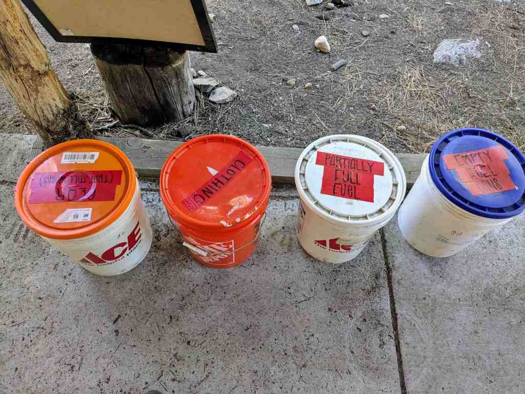 A tady? Patnáct barelů rozdělených podle kategorií: snídaně, svačiny, koření, lékárnička, hygiena, oblečení… ráj pro unavené poutníky. Potravinové barely jsou hodně plné. Přebíráme je, hledáme si, co bychom mohli potřebovat a co se nám vejde do bear canistru. Naopak jsme tu necháváme pár našich věcí, končí tu také naše burákové máslo, pro které tu byl i speciální barel. Pokud budeme šetřit a nebudeme se flákat, vystačíme až do konce a nebudeme muset opustit trail..